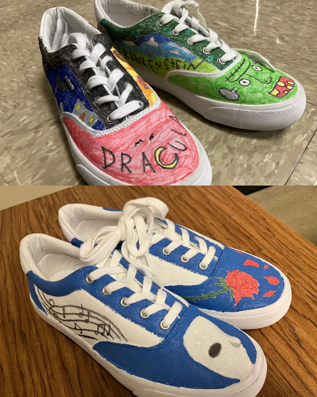 Through symbolic colors, imagery, and scenes, the shoes reflected key ideas such as duality, darkness, and transformation. The project offered students a unique way to connect with classic literature—blending creativity with deeper analysis in a memorable, hands-on way.