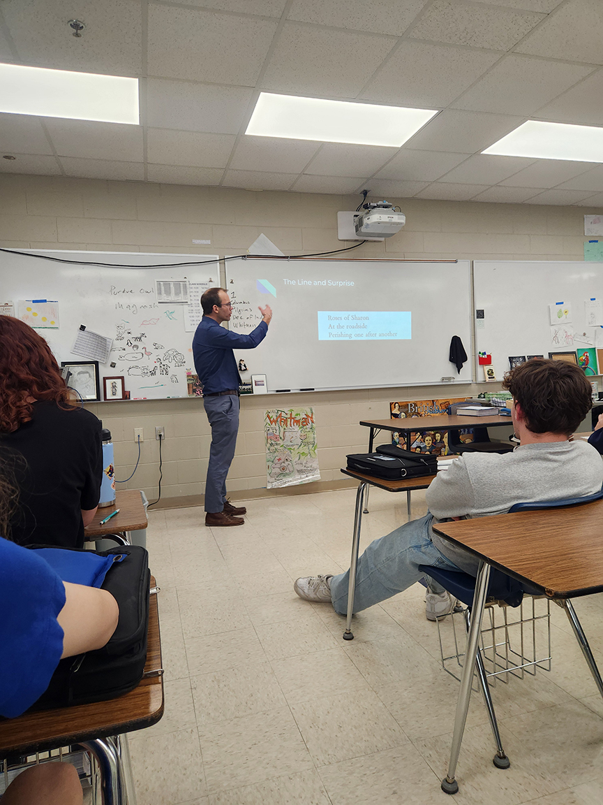 Ripon High School’s Creative Writing class welcomed guest poet Max Schleicher for a special visit. Schleicher, a visiting poet at Ripon College, introduced students to the Japanese poet Basho and led an engaging activity that had them reflect on the journeys their feet have taken—then turn those reflections into poetry.